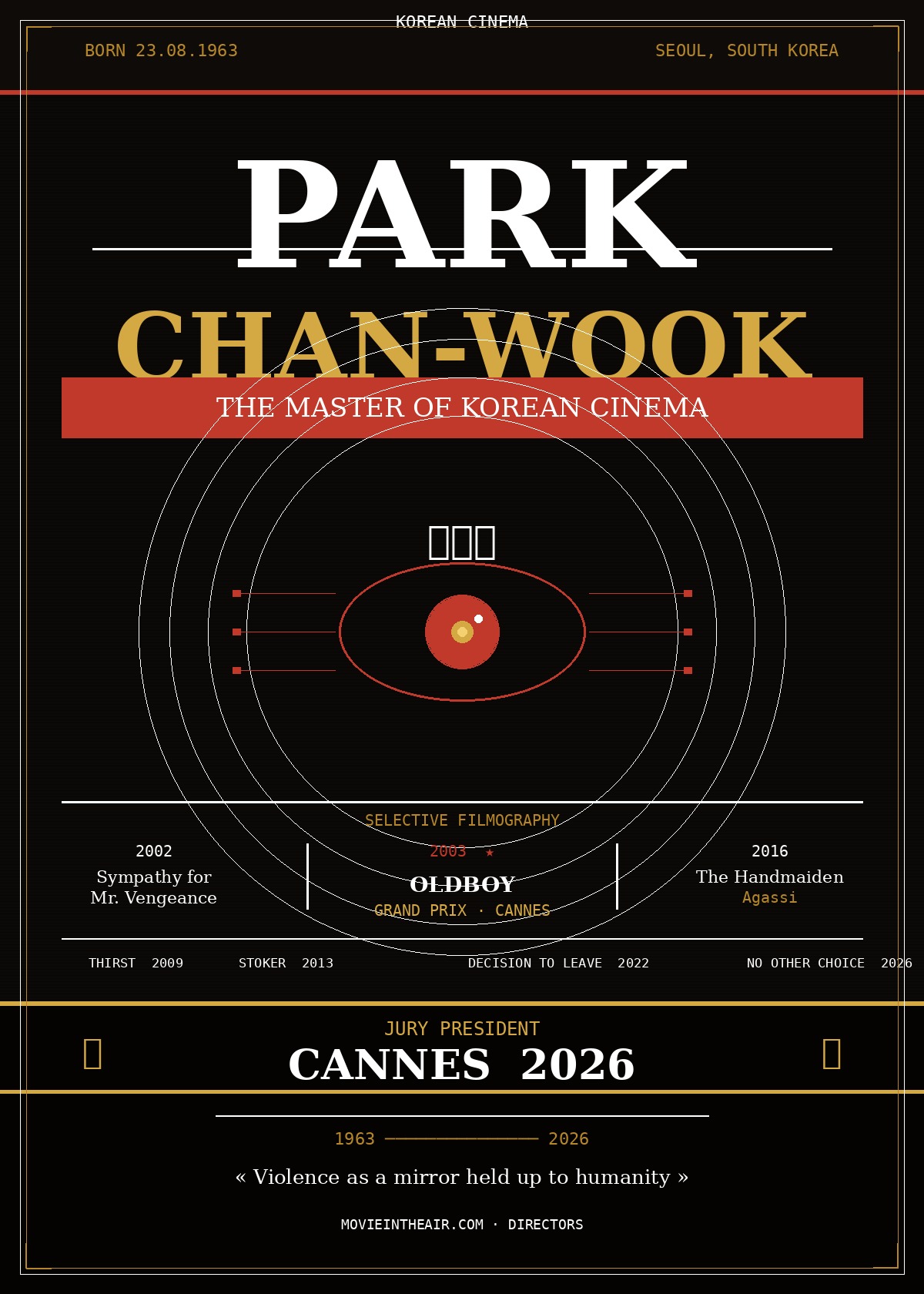 Park Chan-wook is one of the most important and influential filmmakers in contemporary world cinema. Born on August 23, 1963 in Seoul, he has built a rare visual and narrative coherence, blending stylized violence, psychological depth, and a troubling beauty that belongs to him alone.